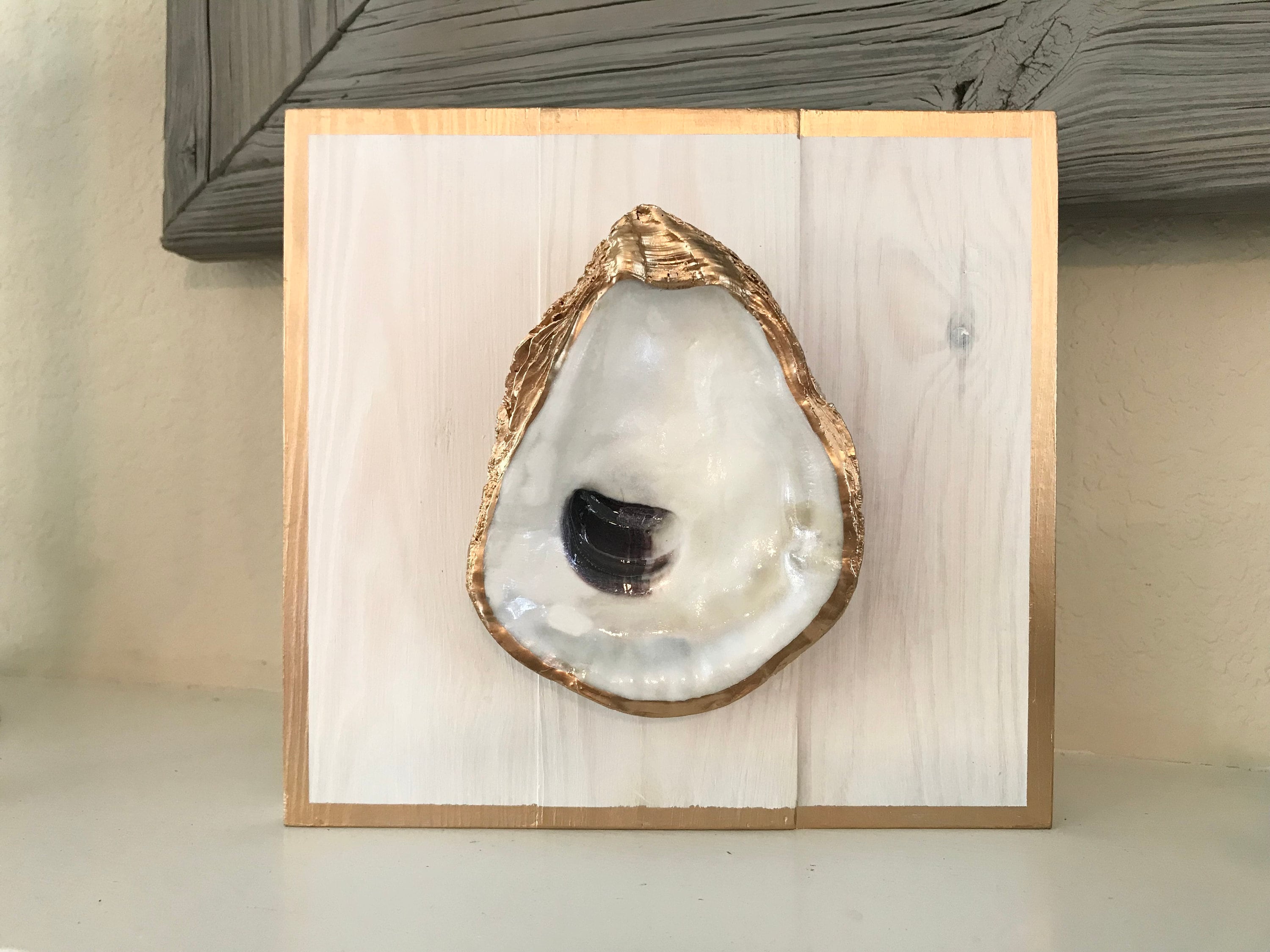 Oyster Art On Wood Large Oyster Shells With Gold Trim White Coastal Beach Decor Etsy